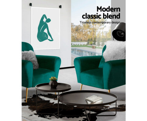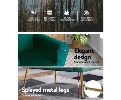 Artiss Caroline armchair offers a wide and welcoming seat with comfortable rolled armrests for you to relax. It is ideal for every corner of your space where you want to add soft and comfy touches. You can style it in your living room, lounge room, or reading room. Crafted with great attention to details, this armchair feature solid wood construction with high resilience foam. It is quite sturdy and will withstand the test of time. Our Caroline armchair is upholstered in soft velvet fabric that epitomises luxury with its smooth and shiny appearance and adds a cosy and relaxing feel to your space. Plus, the splayed golden metal legs with floor protectors will offer optimum stability and protection to your floors and add a luxurious charm to your space with its gorgeous presence.