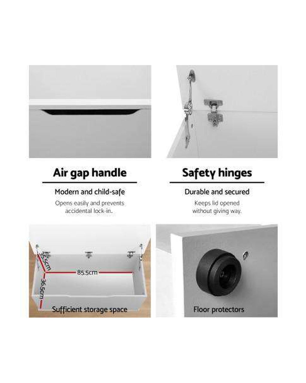 Made of sturdy 15mm particle board, the box measures 92cm long and 40cm wide with a depth of 40cm. It is compact and deep enough to store all of his or her favourite play things without fuss. With a white paper finish, the child-safe box also features a thoughtful air gap between the lid and box for finger protection. Not least, the box also comes with floor protectors to prevent damage and scratches on your pristine floor.