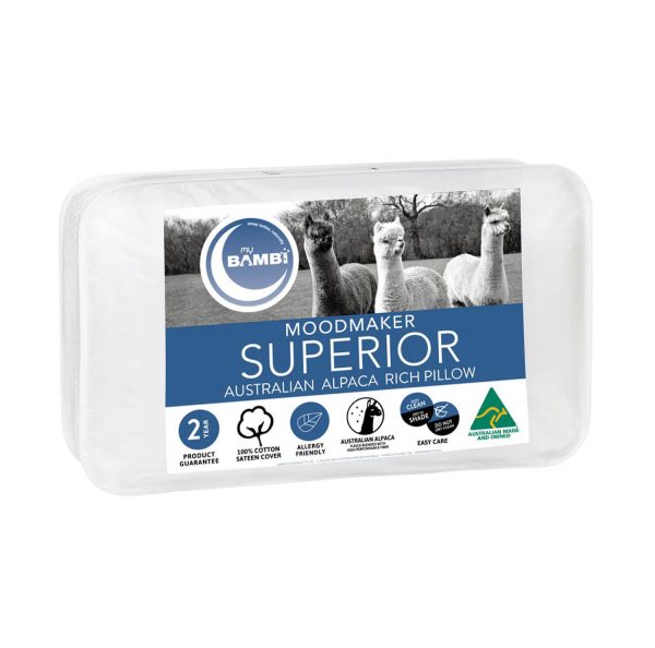 The Bambi Moodmaker Superior Australian Alpaca Pillow is the ultimate in luxury and comfort, using only the finest Australian Alpaca fleece and finished with a pure sateen cotton cover. Let your head sink into a generous 60% Australian alpaca – 40% high-performance polyester fill that is naturally hypoallergenic and temperature regulating. Backed by the Bambi 2-year product guarantee, enjoy dream-like sleep for years to come.