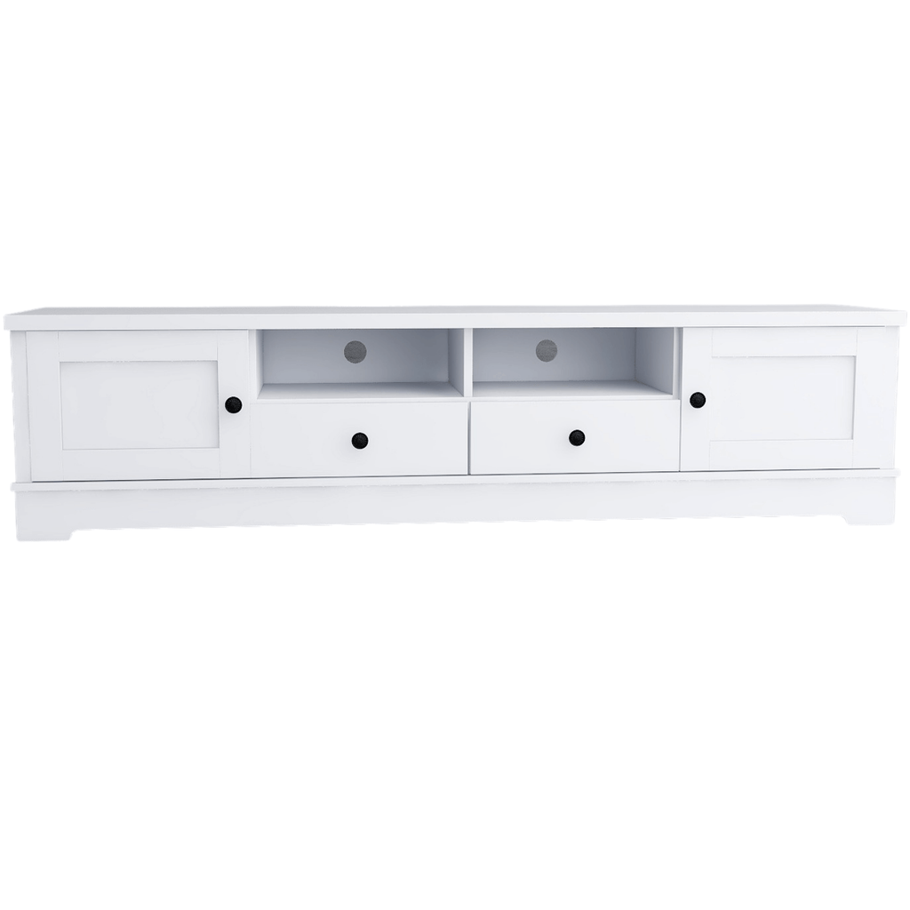 Featuring 4 large shelves and 2 large drawers, the TV Stand can pack a lot in while keeping the clutter out.