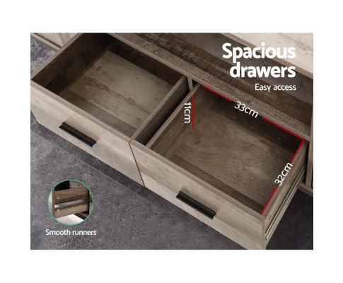 Your treasured home entertainment system deserves the best cabinet for it. And that is why our Artiss Marca Entertainment Unit is the ideal choice for you. Incorporating a contemporary industrial-look design and presented with 15mm and 12mm thick E1 particle board with durable powder-coated steel tube base that provides an eclectic touch, our entertainment unit displays great craftsmanship with equally fine hardware to ensure trouble-free use every time. The unit offers ample storage space with one open shelf, two deep cabinets with magnetic door catches, and two spacious accent drawers with anti-rust runners and beautiful ethnic-pattern front for all your entertainment essentials. Better still, the ensemble features black metal handles on drawer and cabinets to maintain the sleek yet industrial appearance. With a design that will surpass trends and fads, our entertainment unit is your definite pick of an everlasting display piece with timeless appeal.