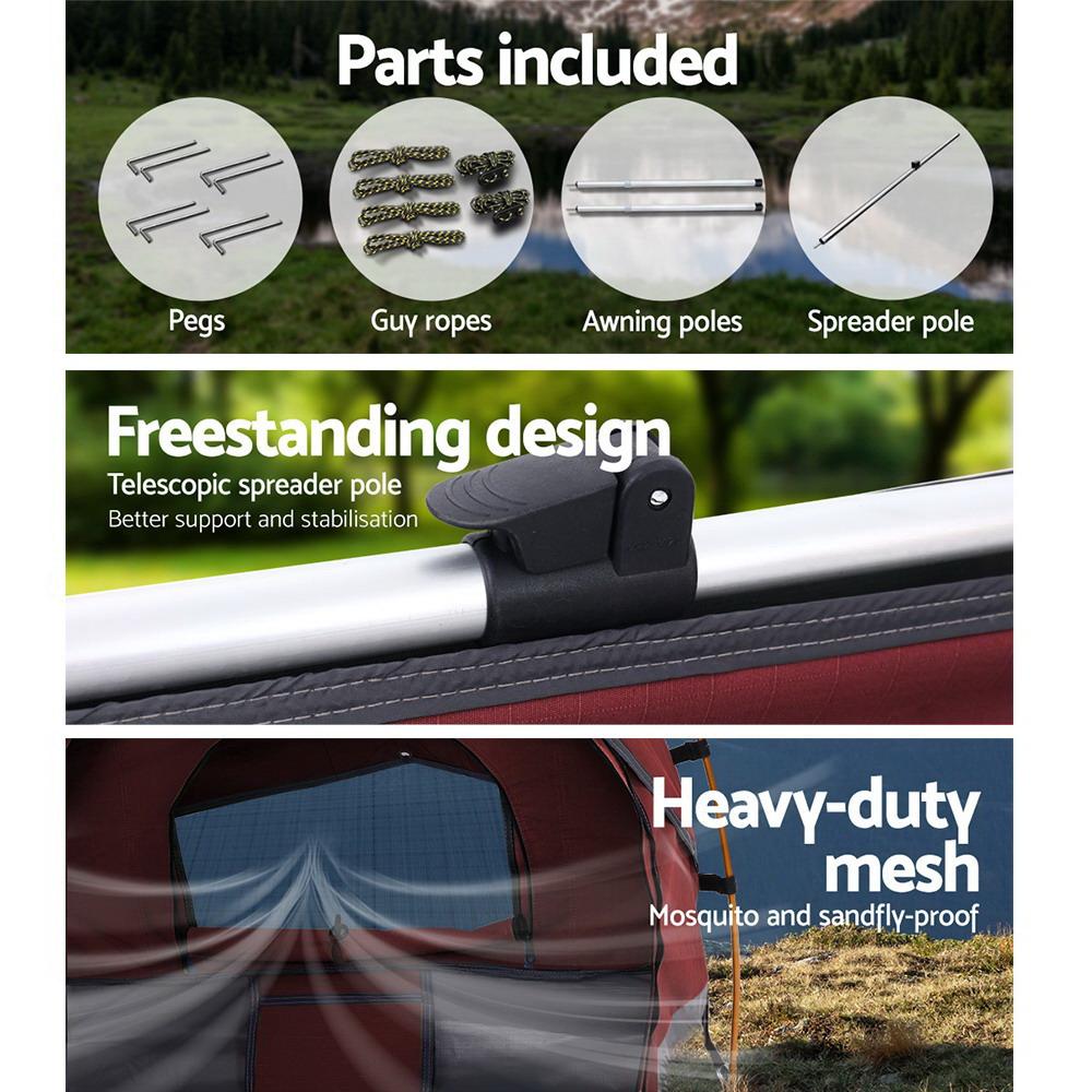 A 14oz 400gsm water-repellent Rip stop canvas cover, 500gsm PVC flooring and an extra 10cm high edge all round. Swagspeak for the ultimate tear-resistant waterproofing. Fully enclosed for privacy with zipped openings for fresh air anytime. Mesh panels to keep insects out. A 70mm high density foam mattress for better sleep on any surface. Thick aluminium support poles to hold up the entire set up.