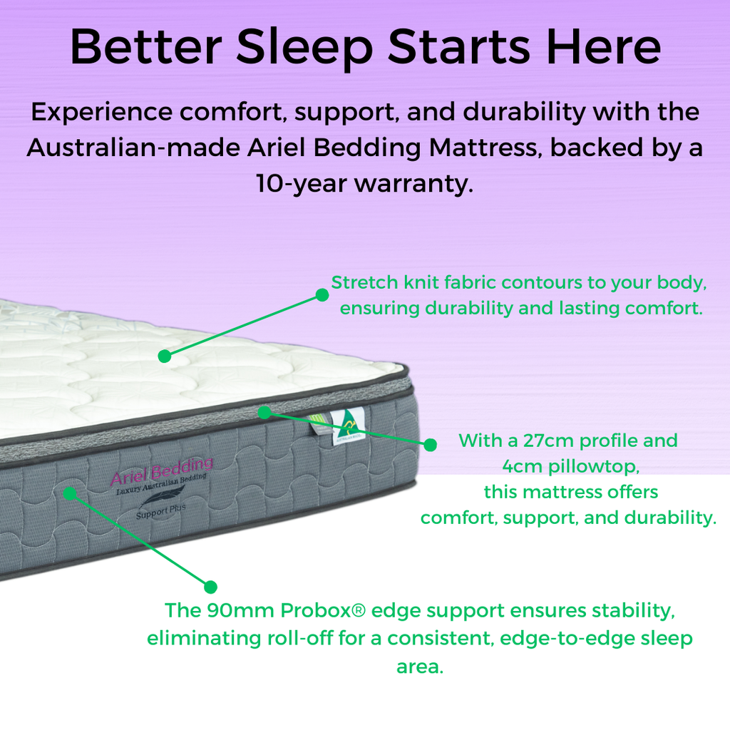 Experience unparalleled comfort and support with the Ariel Bedding Mattress, designed to elevate your sleep experience and enhance your overall well-being. Proudly Australian made and backed by a 10-year warranty, this mattress delivers the perfect balance of luxury and durability for restful nights and energized mornings.