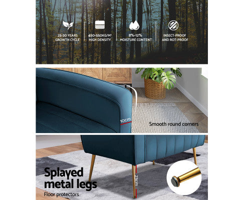 Artiss Kate armchair offers a wide, high-back, and welcoming seat with comfortable armrests for you to relax. It is ideal for every corner of your space where you want to add soft and comfy touches. Crafted with great attention to details, this armchair feature solid wood construction with high resilience foam. It is quite sturdy and will withstand the test of time. Our Kate armchair is upholstered in soft velvet fabric that epitomises luxury with its smooth and shiny appearance and adds a cosy and relaxing feel to your space. Plus, the splayed golden metal legs with floor protectors will offer optimum stability and protection to your floors and add a luxurious charm to your space with its gorgeous presence.