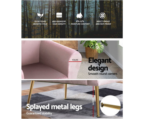 Artiss Caroline armchair offers a wide and welcoming seat with comfortable rolled armrests for you to relax. It is ideal for every corner of your space where you want to add soft and comfy touches. You can style it in your living room, lounge room, or reading room. Crafted with great attention to details, this armchair feature solid wood construction with high resilience foam. It is quite sturdy and will withstand the test of time. Our Caroline armchair is upholstered in soft velvet fabric that epitomises luxury with its smooth and shiny appearance and adds a cosy and relaxing feel to your space. Plus, the splayed golden metal legs with floor protectors will offer optimum stability and protection to your floors and add a luxurious charm to your space with its gorgeous presence.