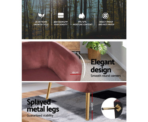 Our Artiss Lois armchair offers a wide and welcoming seat for you to relax and is ideal for every corner of your space where you want to add soft and comfy touches. Crafted precisely and constructed with premium solid wood and high resilience foam, this armchair is quite sturdy and is sure to stand the test of time. It is upholstered in soft velvet fabric that epitomises luxury with its smooth and shiny appearance and adds a cosy and relaxing feel to your space. Plus, the splayed golden metal legs with floor protectors will offer optimum stability and protection to your floors and add a luxurious charm to your space with its gorgeous presence.