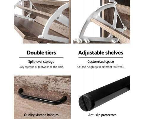 You're shoe proud. That's why you need ample space for all that wonderful footwear. Organise and save your floor space with this industrial chic Shoe Cabinet and have a clutter-free entrance at all times. Designed with adjustable level shelves, you can fit different-sized shoes, heels or boots in the designated row. Making it effortless to get and put back tidily each time after used. With two rows per compartment, there are plenty of space for your shoe paradise. In fact, the entire ensemble can be home of up to 16 pairs of your favourite footwear. Not least, the Shoe Cabinet is finished in a lovely wood grain with meticulous attention to quality craftsmanship. An outstanding presence that makes for a great welcome in any home. Get your 2-level Shoe Cabinet today.