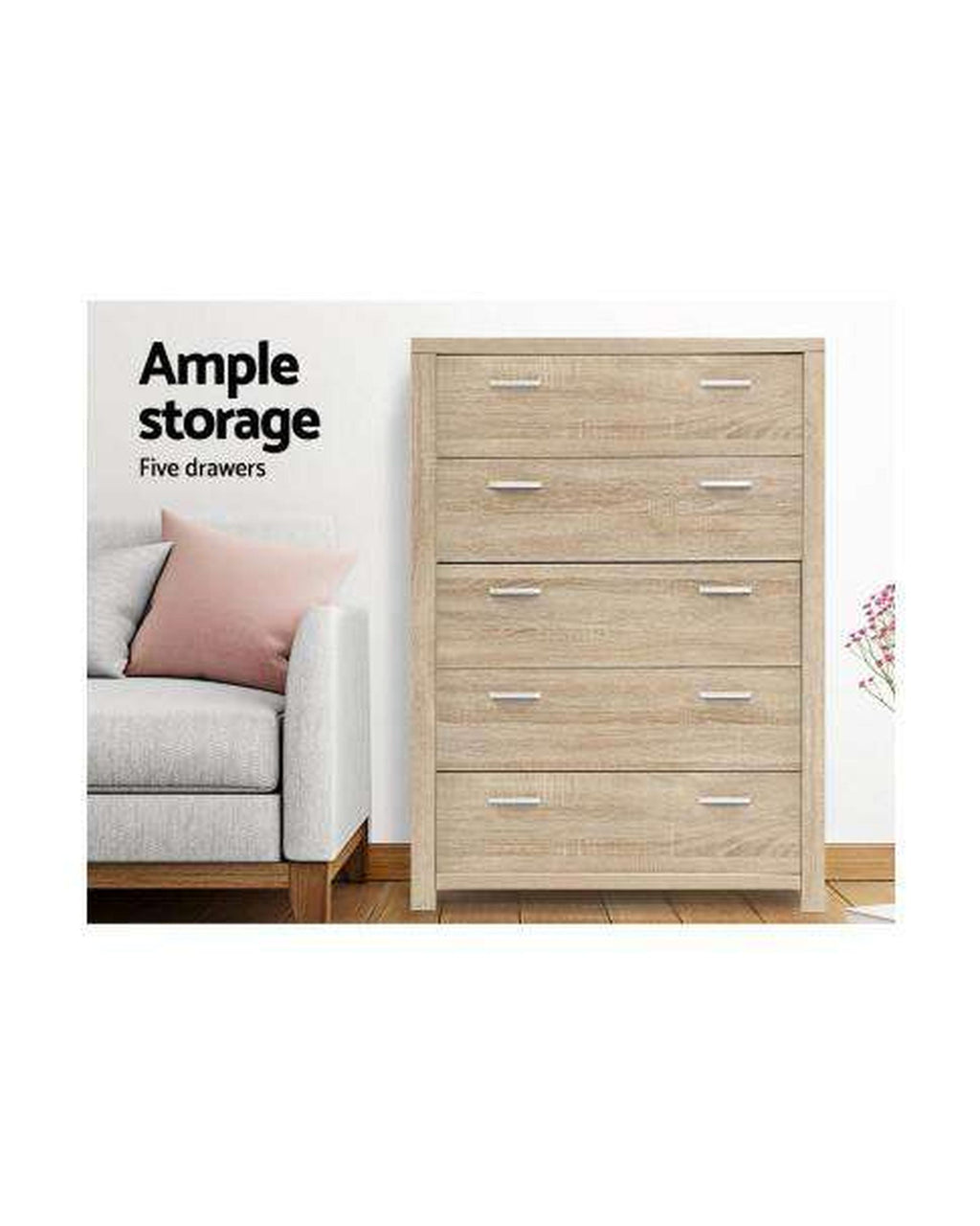 Practical and handsome, our Artiss Maxi 5-drawer Tallboy is perfect for those looking for extra storage space for your home. Contemporary and simply designed, this beauty is crafted from 30mm thick honeycomb and 15mm thick particle boards with beautiful natural woodgrain finish that will easily match your modern home décor. It provides plenty of storage space with five generously sized drawers for all your personal essentials. The drawers are easy to open and close, thanks to their smooth coated drawer runners that ensure smooth operation at all times and the elegant double handles also make it convenient to access the drawers effortlessly. Anti-scratch floor protectors fitted at the base of the tallboy keep your floors in pristine condition with every use. And best of all, you can also match with other products from the Maxi series for the complete simple-natural look.