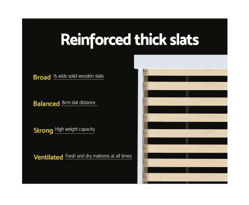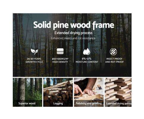 Made of natural pine wood, the Artiss Conqueror Bed Frame is ideal for kids as it for any adult. Strong and sturdy, the bed frame comes with a solid plywood slated base, reinforced supports across the frame, heavy-duty steel fixings and smooth edges all round. Finished in a non-toxic, eco-friendly white paint, the neutral coloured bed frame is also very practical with ample storage from a headboard that comprises three open compartments and a closed shelf that folds down as well as more room beneath the bed frame for optional trundle drawers or any storage boxes. Fact it, this charming bed frame is designed to please in more ways than one.