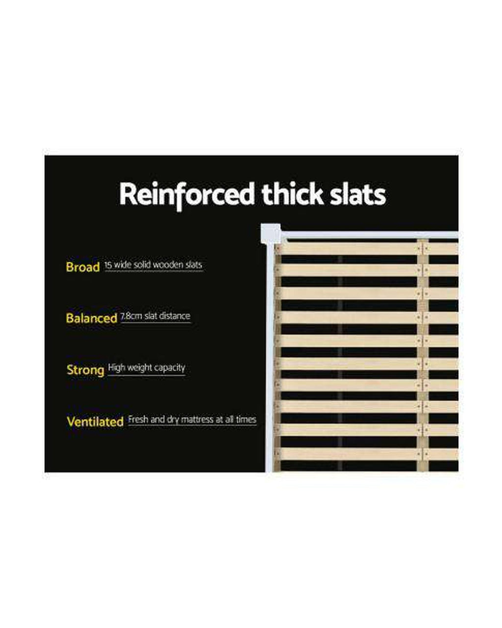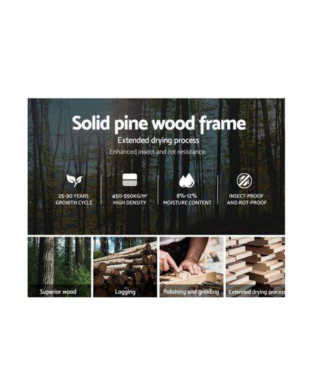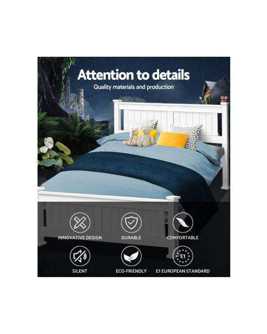 Made of solid pine wood, the Rio Bed Frame is compatible with most Australian sized mattresses and ideal for use by both young and old alike. Strong and sturdy, the bed frame comes with a durable plywood slated base, reinforced angled brackets for long term support, stylish headboard, heavy-duty steel fixings and smooth edges all round. Finished in a non-toxic, eco-friendly white paint, the neutral-coloured bed frame makes for easy décor coordination. Better still, the bed frame also has ample room below it to fit in a pair of optional trundle drawers or any other storage boxes.