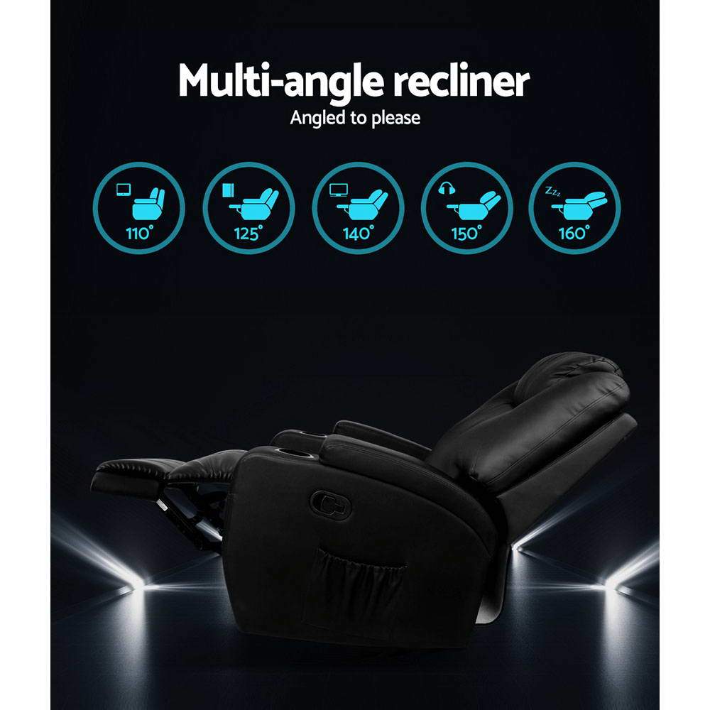 Say goodbye to stiff muscles, back aches, sore necks, tense legs and general lethargy each time you have a seat in this ever-helpful and marvellous Massage Recliner Chair. With its 8-point heated massage, you enjoy great massages all over your body; back lumbar and legs, just like you are experiencing it with a real masseur in the comfort of your favourite recliner. The backrest is adjustable as is the footrest so that you can get into your desired position for a truly soothing massage. It also has rocking feature that allows you to rock yourself into deep relaxation. But great massages are just half the story. Upholstered in premium PU black leather, the massage chair is also a plush recliner, complete with luxurious padded seating, handy cup holders on both armrests and a 360 rotating function that allows you to face any direction you desire.