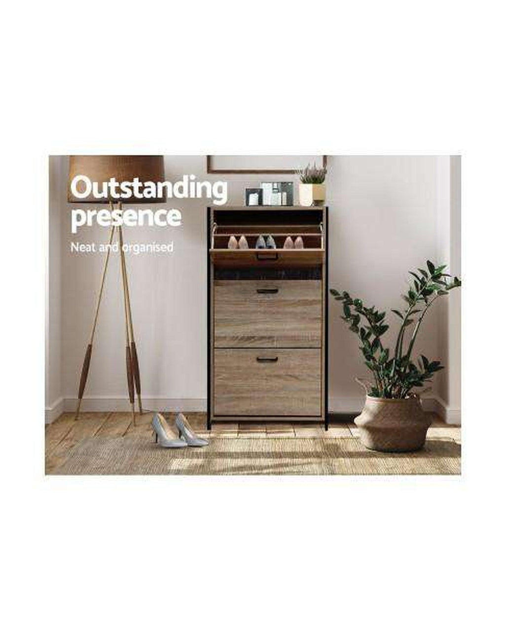 You are shoe proud. That is why you need ample space for all that wonderful footwear. Organise and save your floor space with our Artiss Shoe Cabinet and have a clutter-free entrance at all times. The three storage compartments are pull-down for easy access and have adjustable shelves so that they can fit different footwear of all shapes and sizes. In fact, up to 24 of your favourite pairs would fit comfortably in it. Solidly constructed with metal side frames, thick particle board and smooth paper veneer finish, the shoe cabinet is strong and durable to withstand daily robust use. Not least, the eclectic industrial design with beautiful black vintage-style handles definitely lends a touch of elegance to any home.