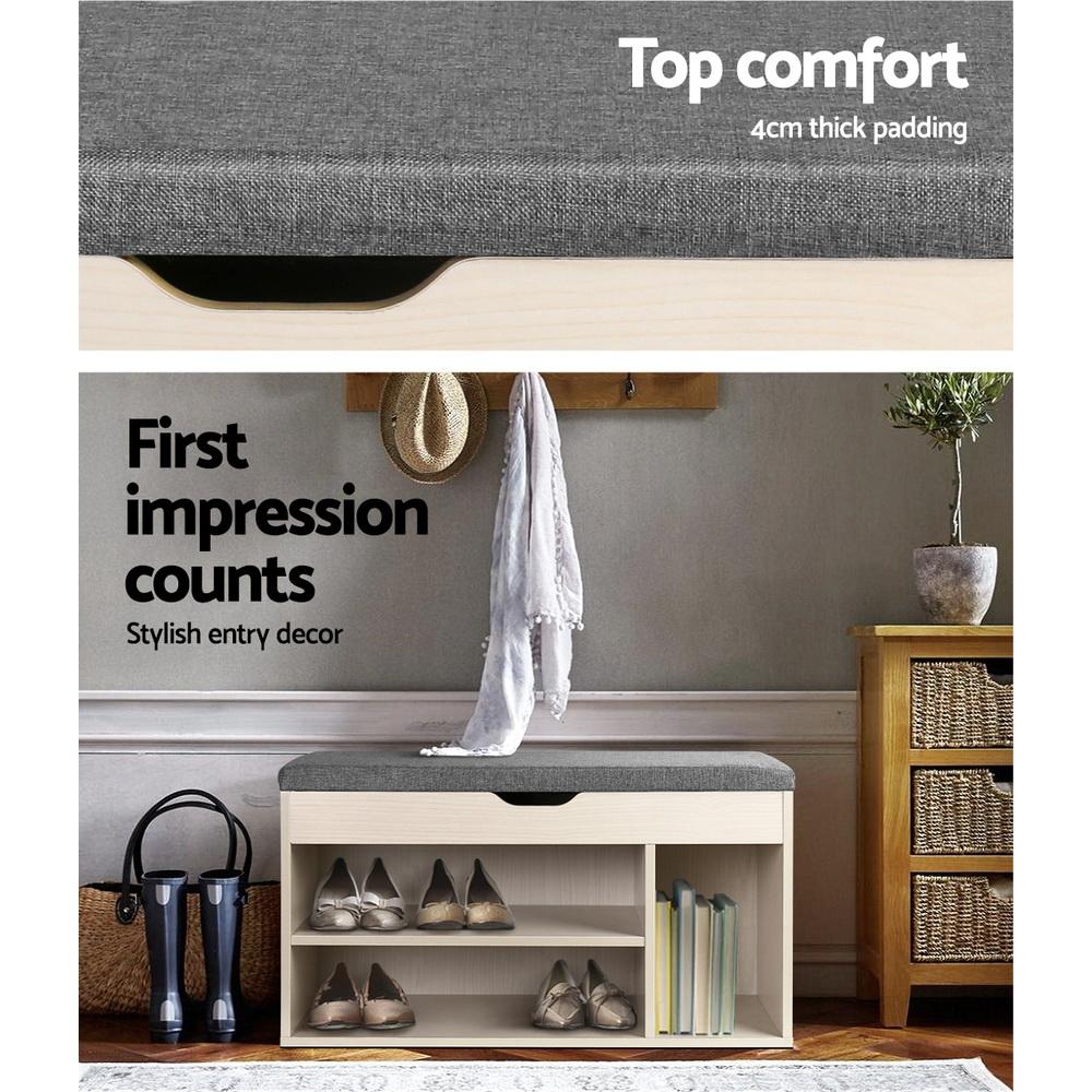 Say goodbye to messy entrances and hallways littered with shoes and footwear all over the place. You can now transform all that clutter into a neat and tidy storage with our Bench Shoe Rack. Made of eco-friendly particle board and finished with a smooth white veneer, our shoe rack has ample space to store up to six pairs of footwear. Shoes, sneakers, boots, heels and sandals are all welcomed to own their spot in the two open shelves and side compartment. Plus, a storage drawer above provides more space for other footwear essentials. Not least, an air-gap handle makes it easy to open the drawer too. To top it off, the entire shoe rack also doubles as a comfortable fabric bench for you.