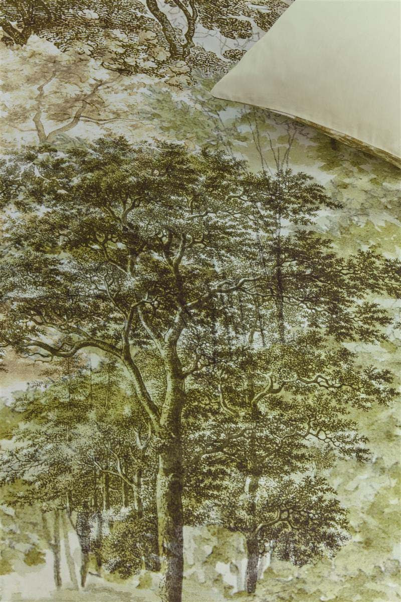 Arcadia depicts an idyllic landscape of wooded hills. The trees are hand-painted and drawn in natural hues. The back of the cover has a uni-dyed sand colour. The modern quilt cover has an elegant sheen due to the sateen weave.