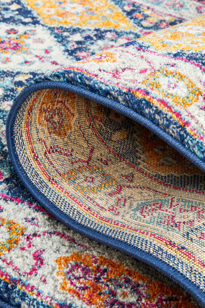 Colorful and culture centric, this Century round rug highlights a multicolored array of interweaving diamonds with ornamental figures plugged inside and long the edges. This fantastic piece heirlooms are power loomed using soft yet durable synthetic yarns and finished with artistic fringe, enriching living areas with bohemian warmth and eclectic style. These rugs offer a terrific modern look to any decor.