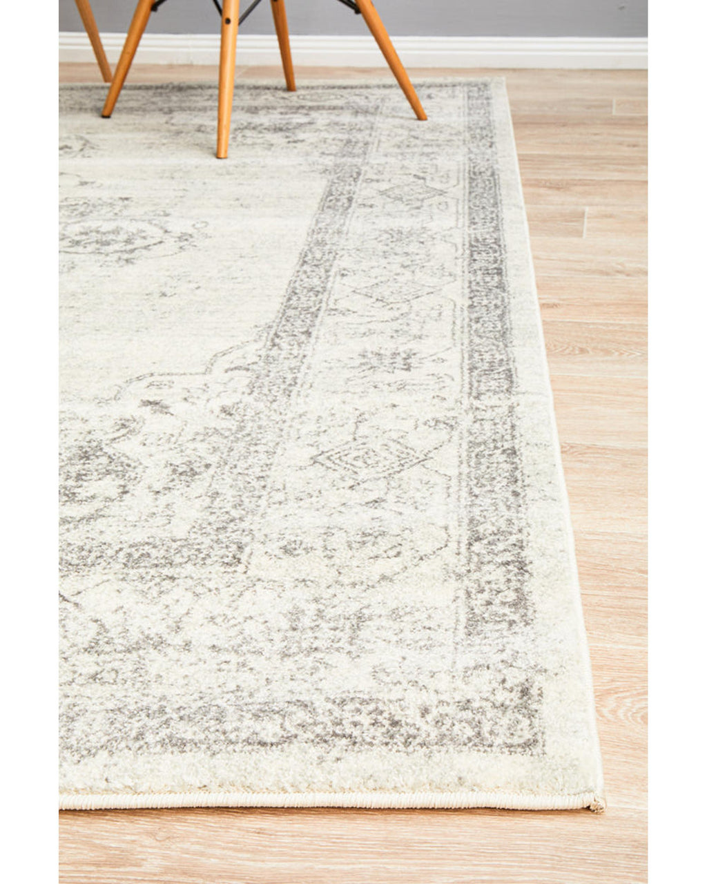 The Century Silver rug used the ingenious technology from Turkey and utilizing quality polypropylene materials to give a premium authentic finish. It features interloping figure scheming surrounds, faded patterning across a stellar center figure on off white silverish tone. These rugs guarantee a mesmerizing focal point in your household with an impeccable array of style, culture and durability rolled into one.