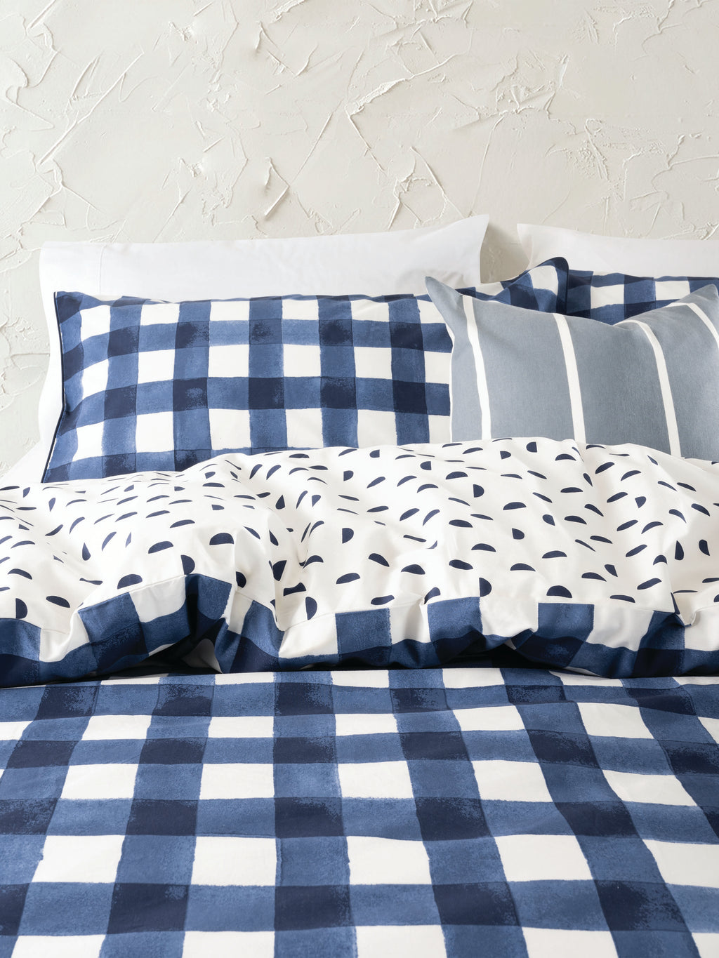 Turn your bedroom into a cosy retreat with this watercolour check print, in a contrmporary combination of tonal navy and white. Versatile and stylish, Georgie is printed on cotton percale and is finished with piping. This set is complemented by a simple geometric print on the reverse.