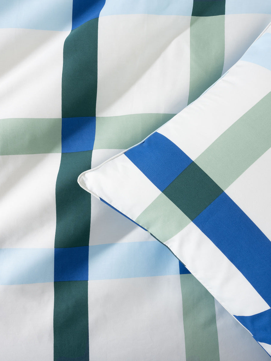 Miley's simplified check enjoys calming shades of blues and greens on a sand-hued base.