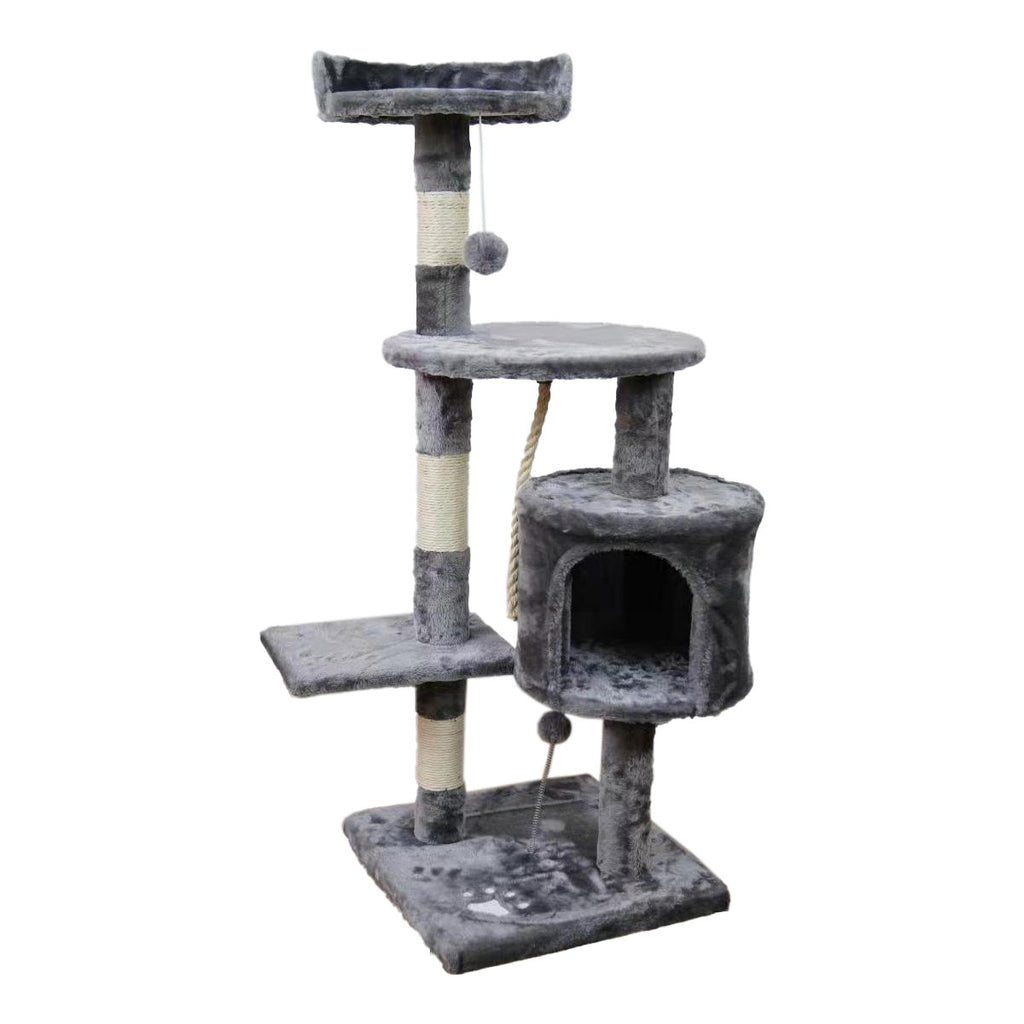 This sturdy 110cm cat tree features a durable wooden frame covered with luxe, plush fabric. Your cats will enjoy jumping to and from the three platforms or taking a nap in the round cubby house. There is also a spring toy, rope and a dangling ball for curious kitties to play with. Lastly, the scratching posts will help keep sharp claws away from your carpets or furniture.