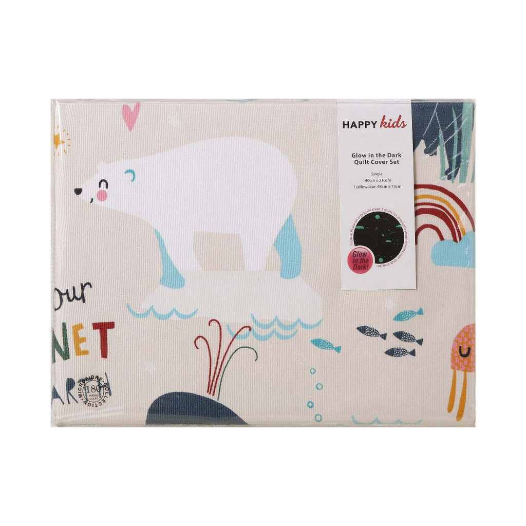 Stay comfortable all year round with this Happy Kids Quilt Cover Set. Great value for money! This bright and fun design could add an element of style to an otherwise plain and boring bedroom decor. To activate the glow in the dark feature of the Quilt Cover the lights must be left on for at least 15 minutes. Then simply turn off the lights after that and see the cool glow in the dark characters.