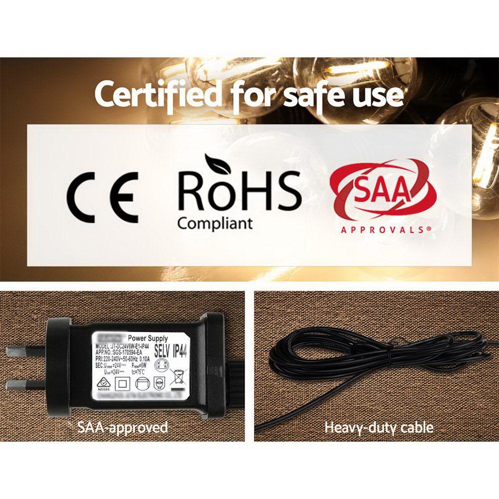 Our Jingle Jollys Festoon String Lights are great not only for wedding and birthday parties or special events, but also for creating a warm, inviting ambience with its bright and mellow glow. Suitable for both indoor and outdoor use, its IP44 rating means that it can be used in the rain and all weather conditions. Each bulb draws a very low voltage and is placed 90cm equally apart from each other throughout its 41m length for an even distribution of illumination and brightness. Not least, the each bulb has a 20,000 hours lifespan so that you can get to use the string lights for quite a while.