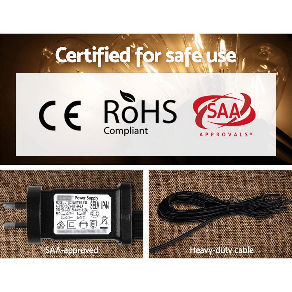 Our Jingle Jollys Festoon String Lights are great not only for wedding and birthday parties or special events, but also for creating a warm, inviting ambience with its bright and mellow glow. Suitable for both indoor and outdoor use, its IP44 rating means that it can be used in the rain and all weather conditions. Each bulb draws a very low voltage and is placed 90cm equally apart from each other throughout its 50m length for an even distribution of illumination and brightness. Not least, the each bulb has a 20,000 hours lifespan so that you can get to use the string lights for quite a while.