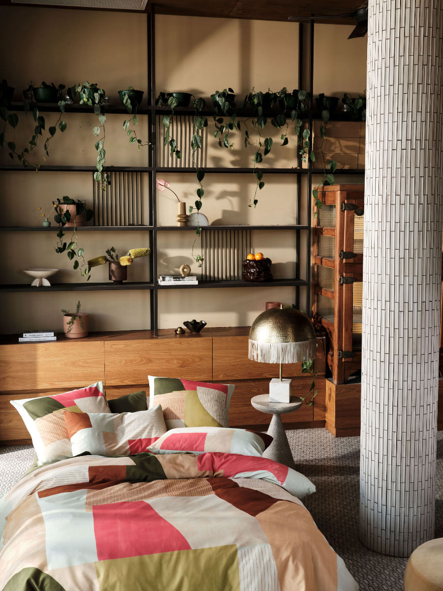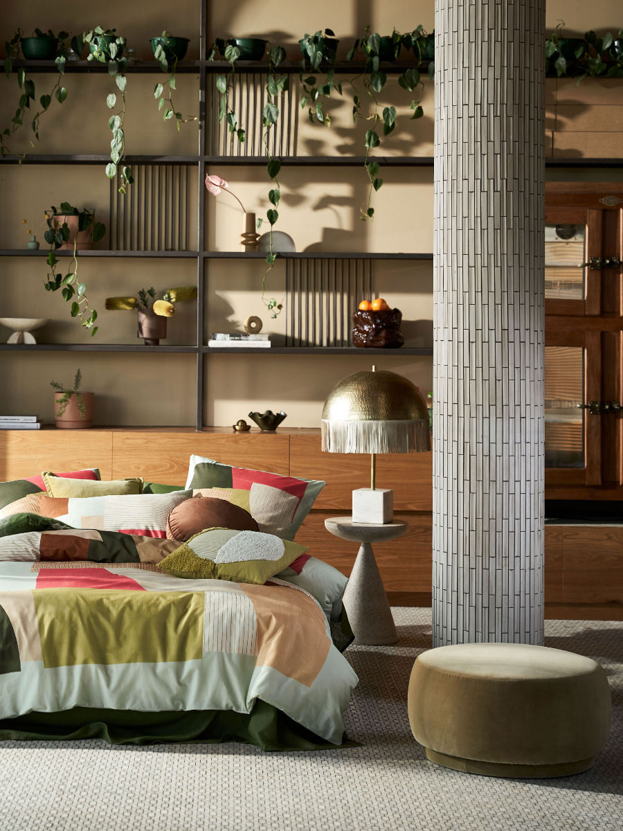 With its painterly, hand-cut textures in a scarf-like composition as well as an earthy palette with pops of coral, this textured cotton slub print will renew your boudoir.