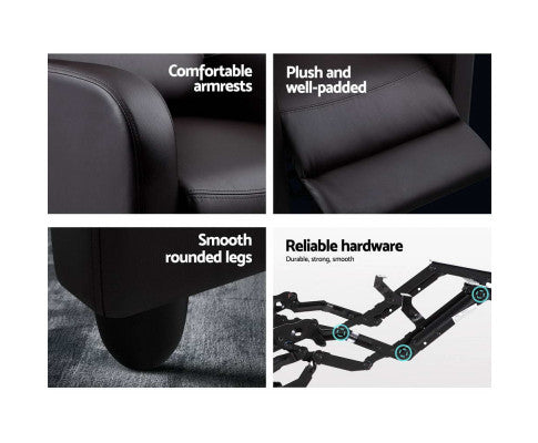 Enjoy the gold class movie experience in your own home with our Artiss Recliner Chair. Richly padded in high-resilience foam and upholstered in smooth and luxurious PU leather, the chair certainly looks like it belongs in gold class. In the upright position, the recliner is a comfortable armchair where you can sit for long chats with guests. Or you can easily adjust the backrest and footrest to recline to your preferred angle. The backrest has three padded zones for full head and back support so that no matter the tilt, you have total body comfort. The chair is suitable in any room with its classic design. Keep it in your study to be perfectly rested during your work breaks. In the living room for watching television or listening to music. Or keep several in the media room for the complete cinema experience. Wherever you decide to put it, you can always sit back and relax on our recliner chair.