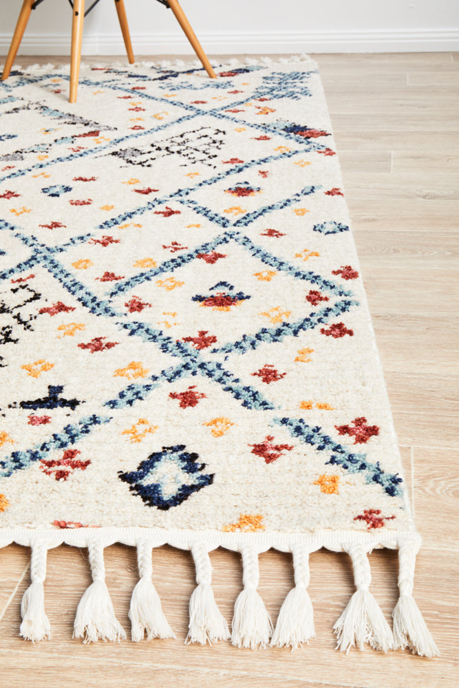 Indulge yourself in this excellent Moroccan berber inspired rug as part of the Marrakesh lineup. This piece strides deeply with bold multicolored palette of diamond patterns duly plotted with mixed patterns giving a truly amazing tribal decor statement. This fine piece of material is expertly woven using polypropylene which highlights a soft 20mm pile, a total eye catcher and everyone would love to have this collection.