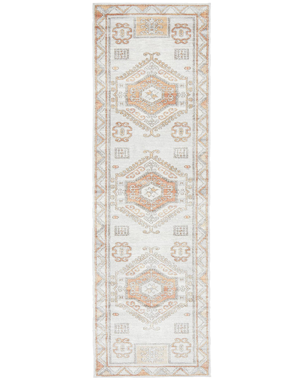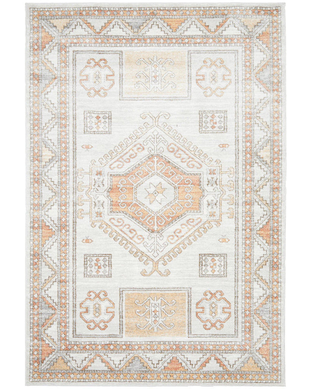 The softest hues flow through this gorgeous Aztec design. Different shades of warm peach and natural pop out of the cool white and silver background. Power loomed with a polypropylene pile, this rug is non-shed and easy care. These rugs offer style, versatility and are available in rectangles, rounds, and runners in a large variety of sizes.
