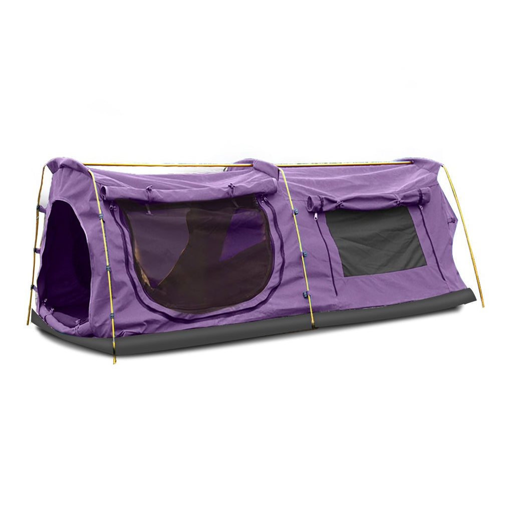 Explore more for outdoor living with Mountview free standing Swag Tent. 380GSM water-repellent rip stop canvas cover, 500gsm PVC flooring and an extra 10cm high edge, it is suitable for each season. Fully enclosed for privacy with zipped openings for fresh air anytime. Mesh panels allow fresh air in and keep insects out. A 60mm high density sponge mattress for better sleep on any surface. Thick aluminum support poles hold up the entire tent firmly. In addition, you will get inflatable pillows, pegs, guy ropes, carry bag and all the extras that make your camping experience unforgettable.