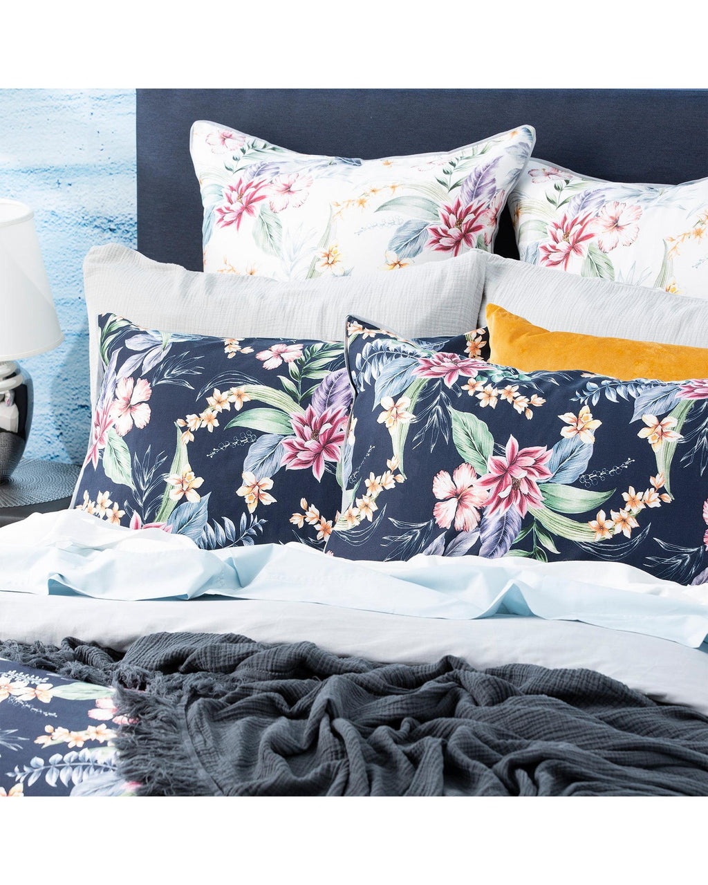 Sophie design is composed in an exciting colour palette brought to life against a contrasting dark hue.This statement print for the season can be used to create a bold look in a contemporary style bedroom. Printed on 300 thread count cotton sateen and complemented by a beautiful matching Chambray print reverse. Complete the look with the matching European Pillowcases.
