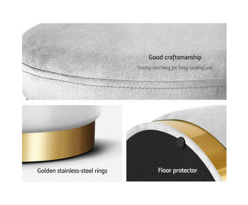 artYour lounge room is the epicentre of the home, so it’s no surprise that you want it to look great. For that extra touch of elegance, look no further than our premium Footstool. With an elegant, tufted seat and upholstered in soft velvet, our footstool is the perfect place to rest your feet and adds a plush touch to any home. Made of quality material, the footstool is strong and sturdy, and stands up to robust use. The stainless-steel gold rings give it extra stability as well as a touch of class, while floor protection pads keep your floors safe and sound. Whether you are using it as extra lounge seating, bedroom décor or your favourite footrest, our multifunctional and versatile footstool matches form with function perfectly and elegantly.