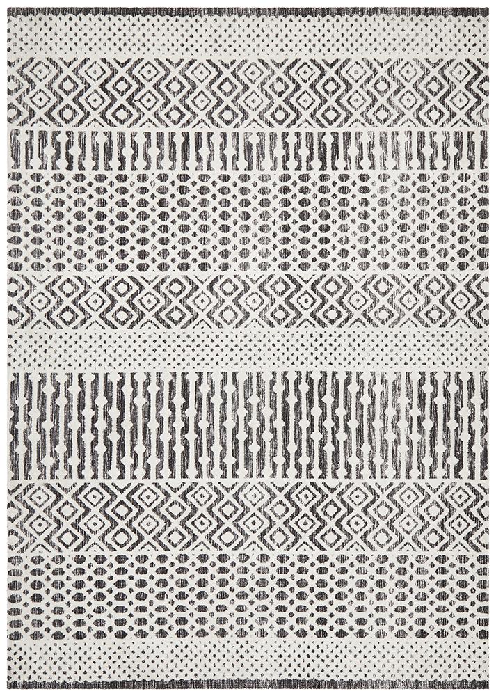 Levi rugs show their originality by utilizing different structures, neutral yet lifting tones and nomadic designs. The Levi Emma range presents several combinations of trellis, diamond and linear designs on white strokes laid in a black milieu imbibing a rustic ambiance to any home or room setting. This rich pile is made from 100% microfibre polyester from India. All edges are strengthened in firm yarns ensuring it's neat and polished finish, they will surely add value and charm.