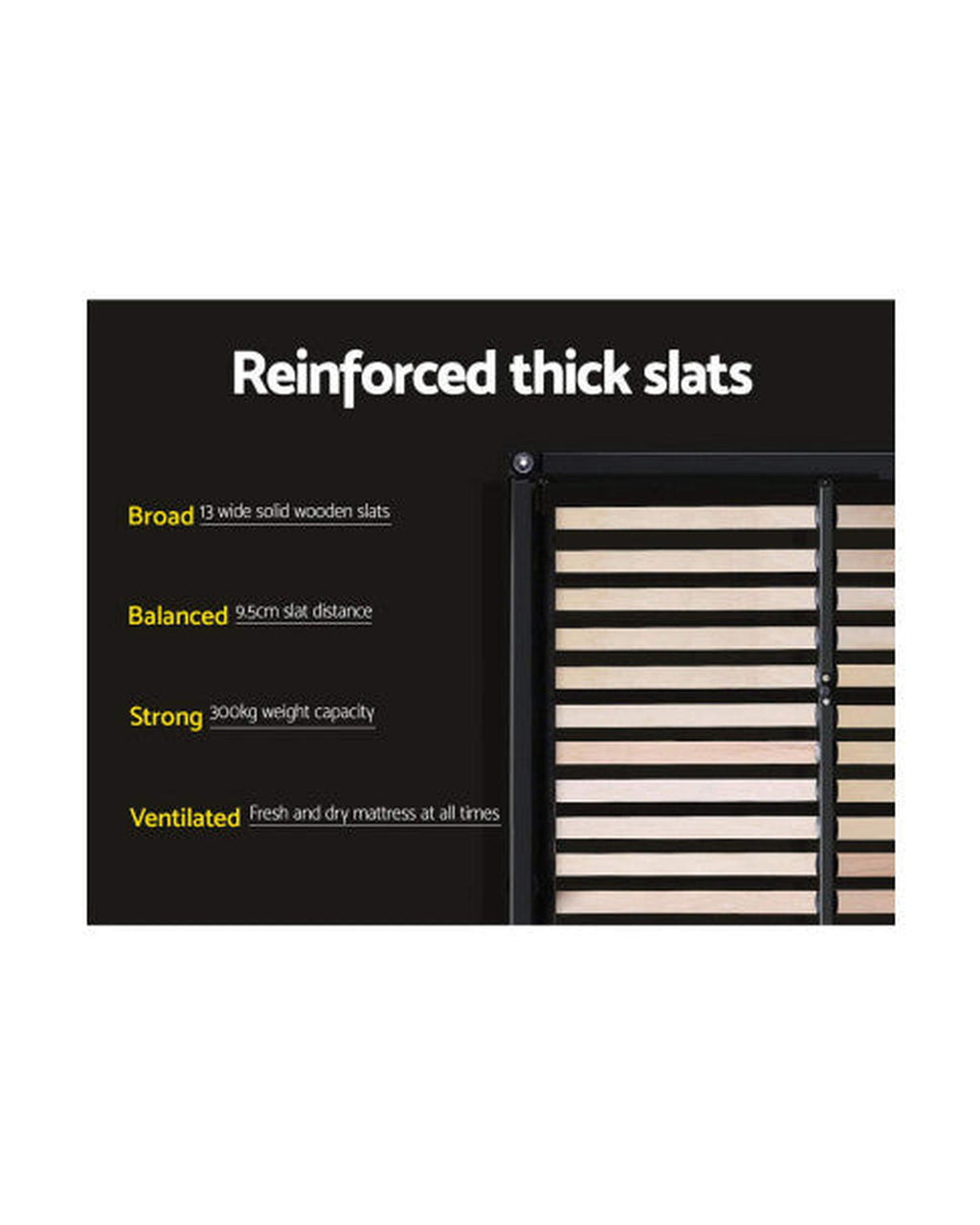 The bed frame is well-built with reinforced steel bars within its sturdy steel frame. Heavy-duty metal connectors keep the frame sturdy with additional central support from an adjustable centre support beam, so you can rest easy at night knowing you have great support.