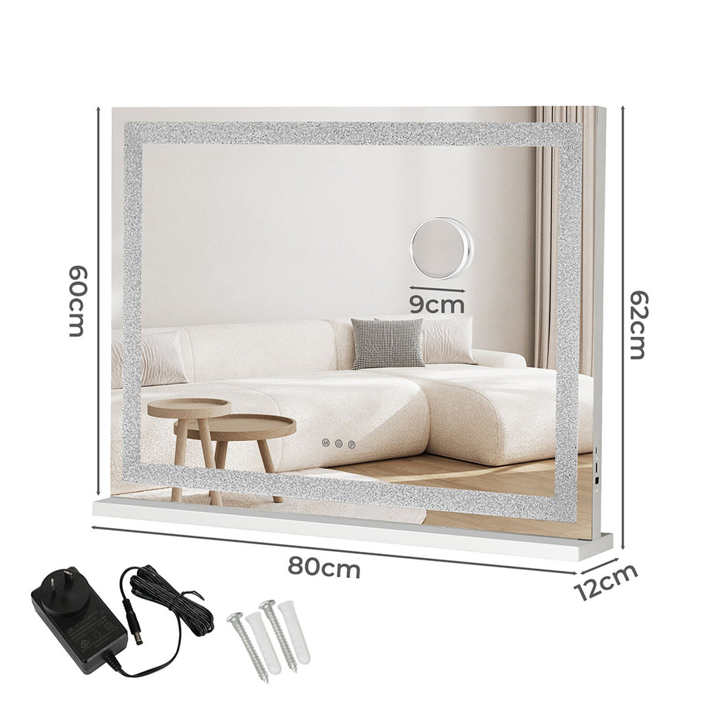 Designed with flexibility, this vanity mirror can be gracefully placed on a tabletop or securely hung on a wall, ensuring it fits into any bathroom or dressing area. Its sleek crystal-like finish and modern touch controls lend a luxurious touch to any space, while its practical features ensure it's a must-have for any beauty enthusiast.